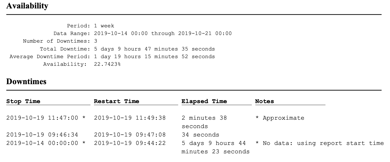 (rep by M. Shimomura) The pdf-report queries the internal log/stat database for downtimes. If the date for the query range cuts off some Resin lifecycle events, then Resin would report the beginning of the range as a downtime. It is misleading for downtime reporting to depend on the query range. The attached screenshot shows a 5-day downtime, which is not correct. We should: 1. improve docs and wording in pdf-report, and/or 2. do a backward scan of the database looking for the start event |